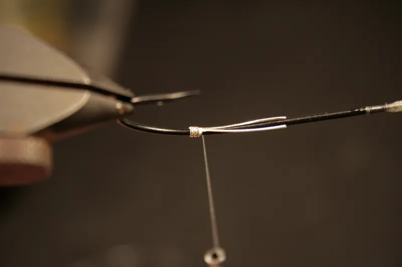 Use 2 wraps to lock the tinsel down and make sure that the two ends lie next to each other on the hook shank. Don't cut off the ends.