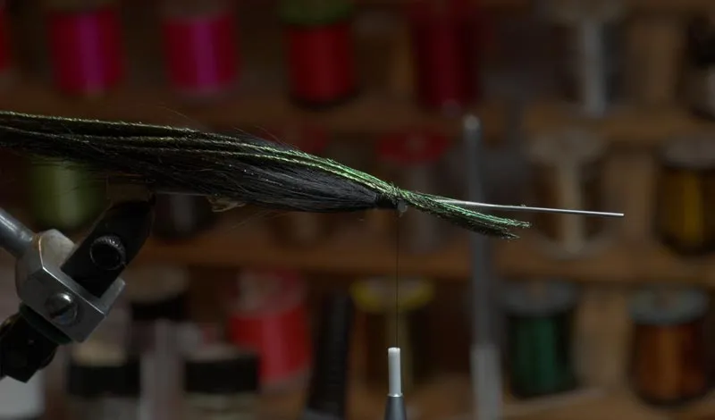After trimming the wing butts, it's time to tie in the peacock herl. Make sure they follow the shape of the wing