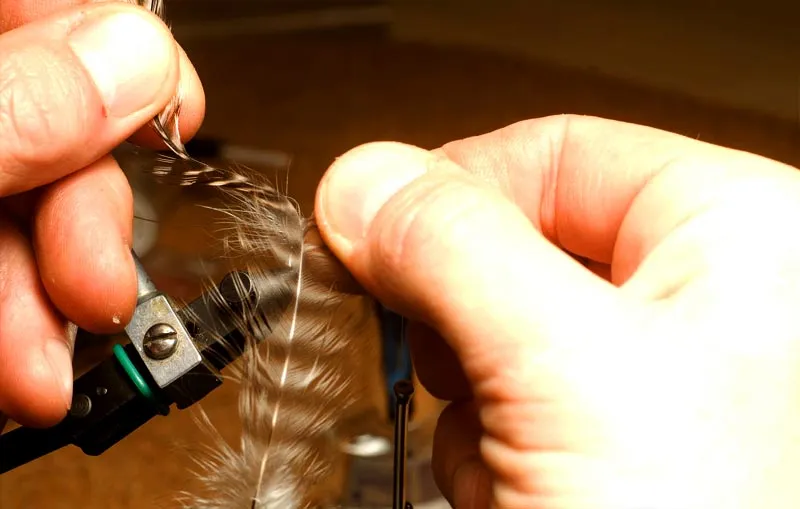 Remove the barbs in one side of a grizzly hackle by simply pulling them off. Turn the feather with the curve or shiny side towards yourself, and remove the right side barbs