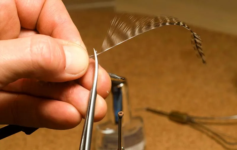 Cut the stem of the hackle in preparation for the tie in. Fold back a few barbs and trim stem, leaving some short stubbs to anchor the smooth stem