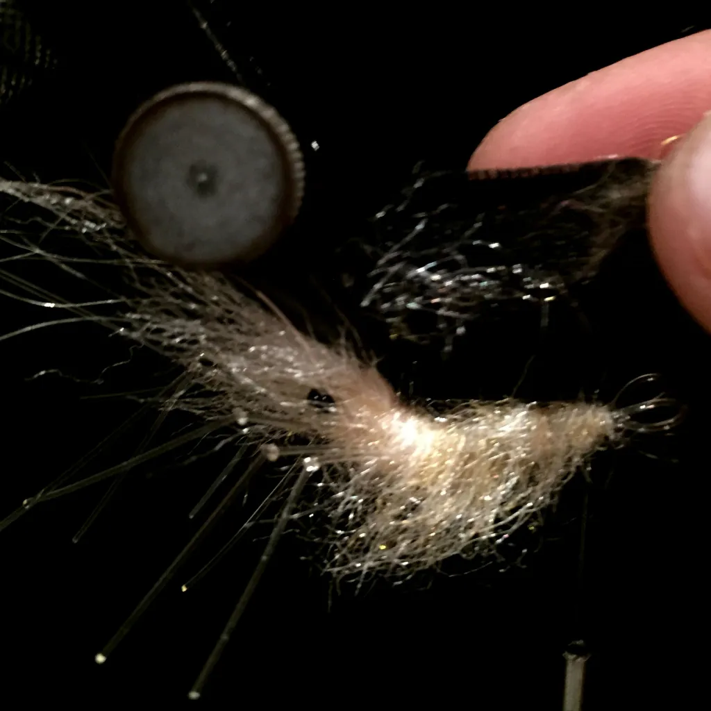 Tease out the dubbing with a Velcro stick to form swimming legs