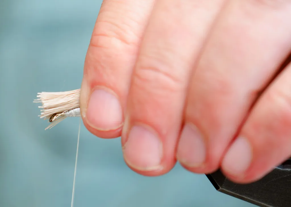Lay the deer hair over the wing base and take a couple of loose turns over the front part of the bunch