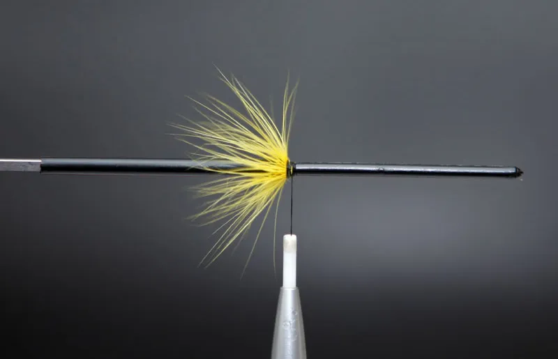 Tie in a yellow hackle by the stem and wind it 3-4 times forward. Tie down and trim surplus.