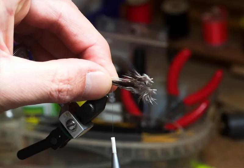 Prepare two small badger hackle feathers and tie them in as a tail. Don't strip the feathers. Leaving the barbs will make the tail more durable and provide a foundation for the tinsel body