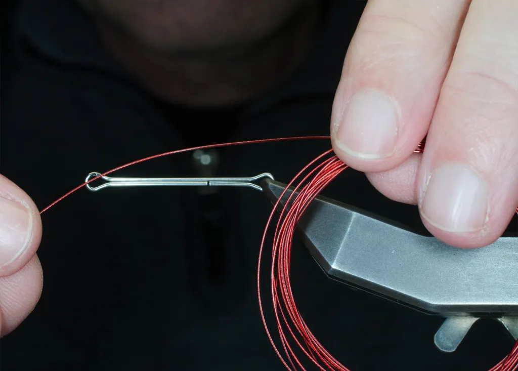 The wire is coated steel wire, typically with a breaking strength of 20-40 lbs.