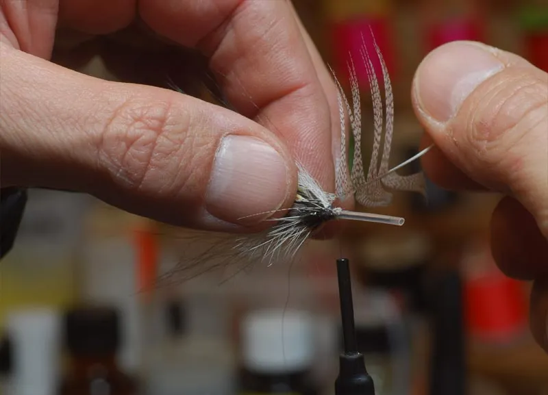 Carefully stroke back the fibers for each turn and make sure the feather doesn't twist while being wrapped