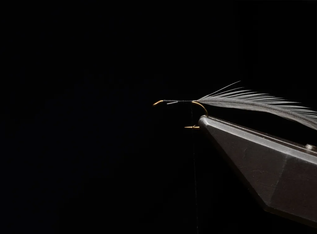 The hackle is ready for wrapping - tied in pointing to the rear, shiny side out