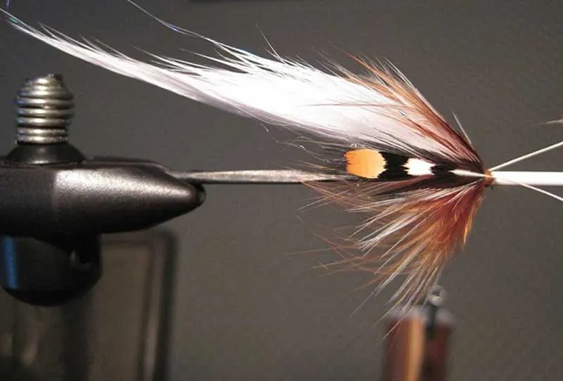 Tie in the Jungle Cock eyes over the hackles and rubber legs