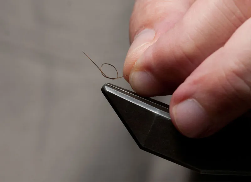 Make a loop on the barb. Pull the tag end through with the needle to form a simple overhand knot