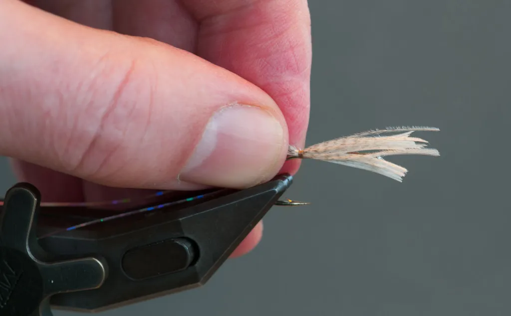 Cut off the longest barbs from both sides of the mallard feather and tie in as a tail over the flash - becoming the thorn and mouth appendages of the shrimp