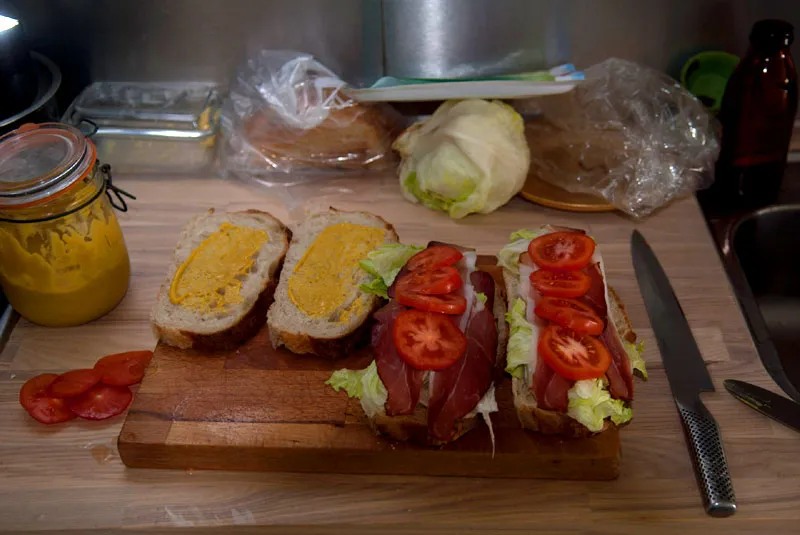 But not overly so. The bread is the main meal, the lettuce and tomatoes the base and the ham is the treat