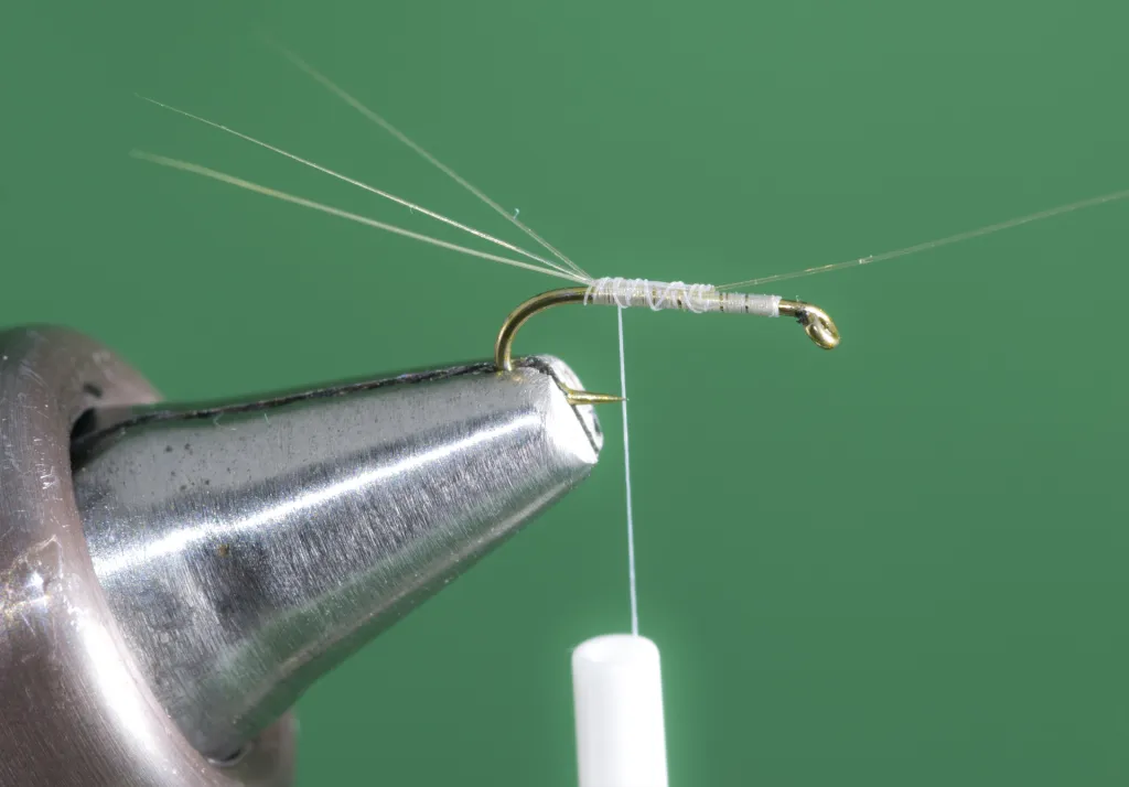 Tie off the spiderweb and the microfibers and stop at 1/3 before you reach the hook eye. Trim the spiderweb and trim two microfibers. Leave one microfiber pointing forward. We use this to tie in the wing.
