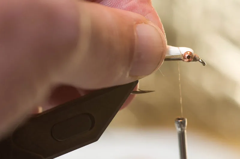 Pass the thread under the hook shank to behind the eyes and tie down the hair right behind the eyes