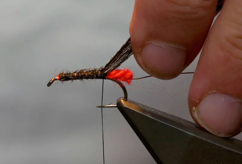 Tie down the herl the full length of the hook shank. Grab the herl and the tying thread.