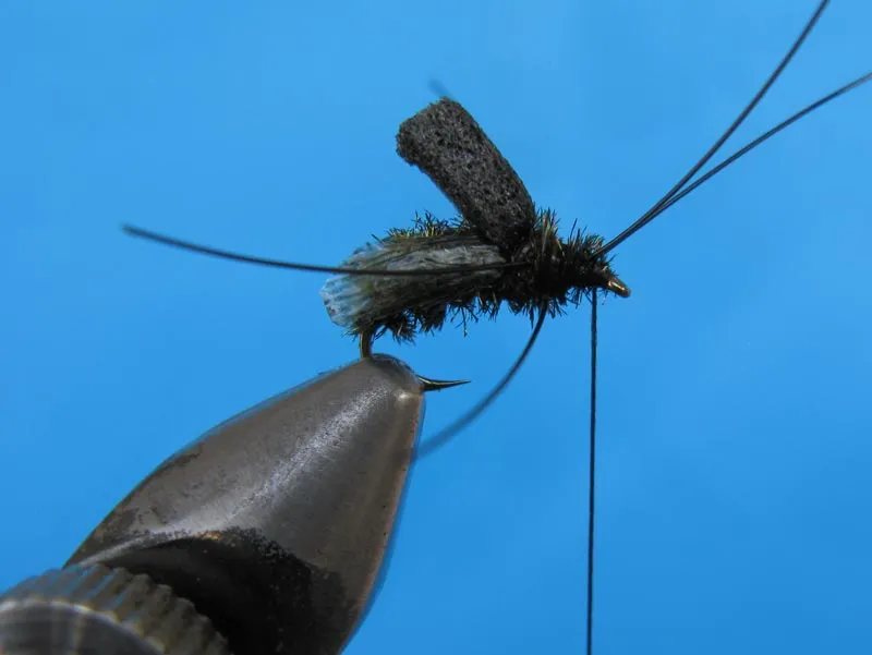 Fix two pieces of monofilament as an "X" and one across on the underside of the fly for the legs. Cover the tie-in spot of the legs with the throrax peacock herl.