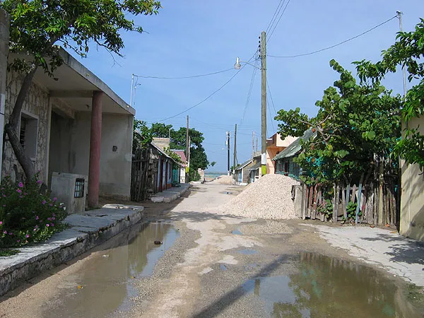 A typical Rio Lagartos street - this one Galle 15. All streets have numbers. Notice the building materials blocking a couple of places. That's just how it is. No car passes here until the material is used up - which can take quite a while.