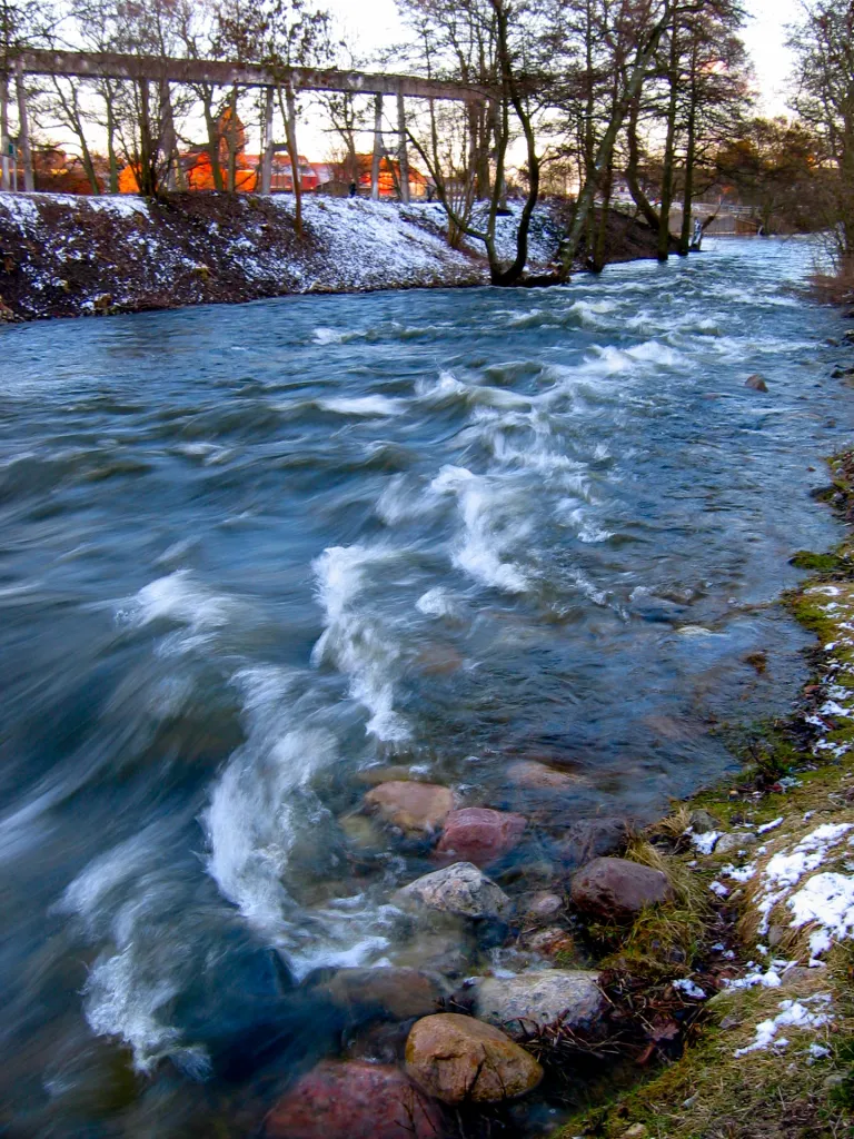 Some parts of the stream has been restored to become spawning ground for sea trout and runs with a large amount of water during the winter and spring melt