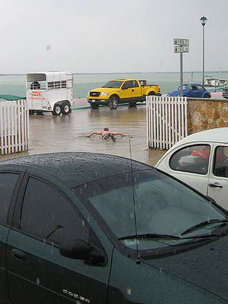 Soeren "swimming" in the large pool that formed in front of the hotel after the heavy rain.
