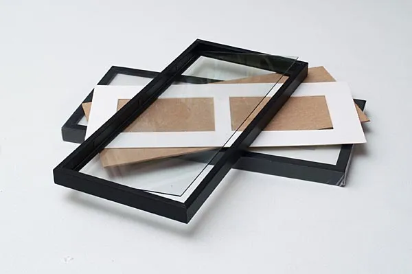 The frame we will use has room for two flies. It consists of a wooden frame, glass, matte and a wooden background. We need to add a cardboard background for the flies to it on.