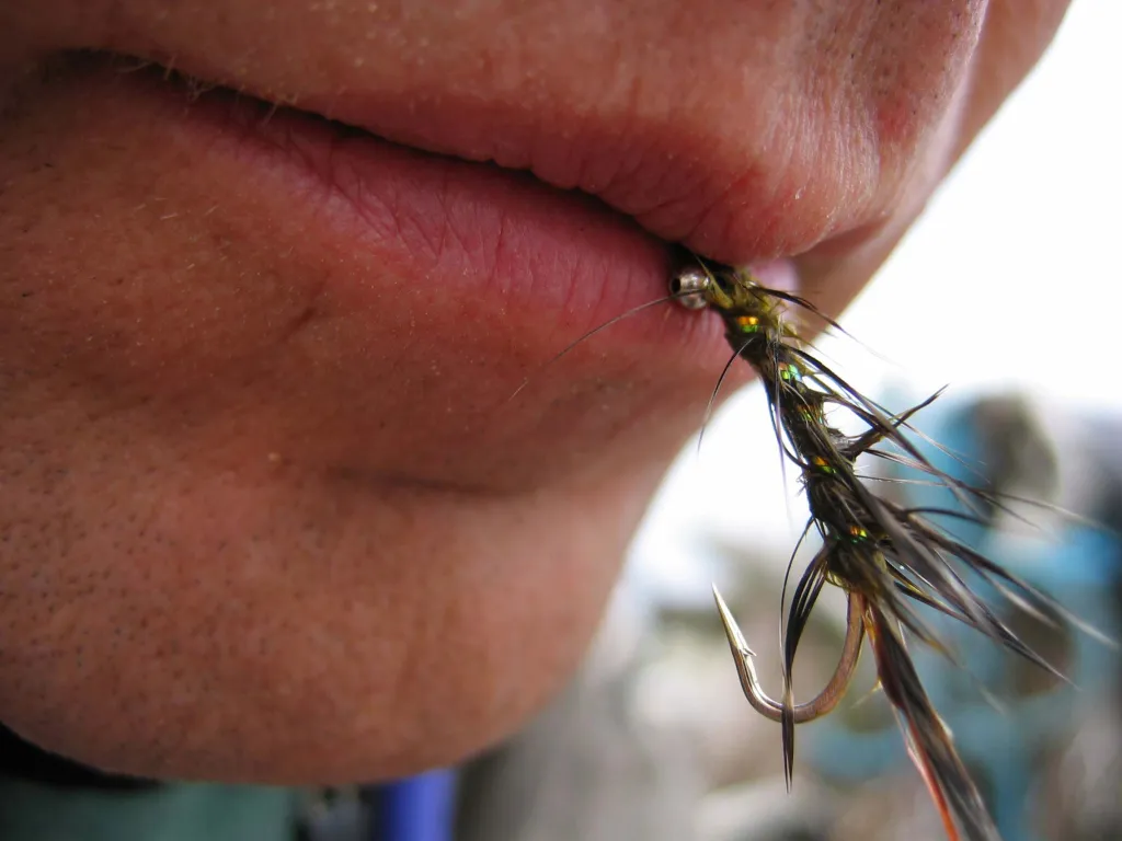 The fly is kept in a “safe” place until the tippet is ready.