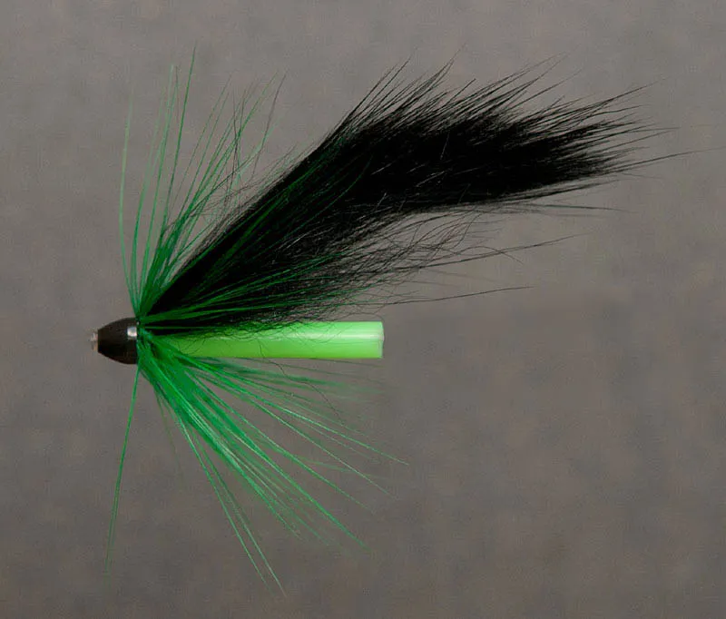 The Bag Fly is a very simple tube fly. You vary the volume and length of the wing by choosing a different fur - not by cutting the strip longer. Notice again how the base of hackles and wings are hidden under the cone.