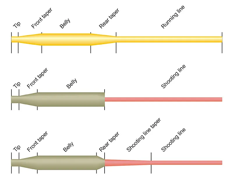 A weight forward line, a two part line (head and shooting line) and a spliced head and shooting line.