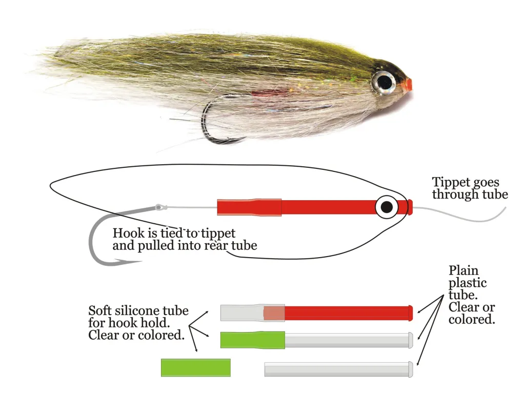 Like all other tube flies, the hook is tied to the tippet after this has been threaded through the tube. Then the hook is pulled into the soft rear silicone tube to set firmly.