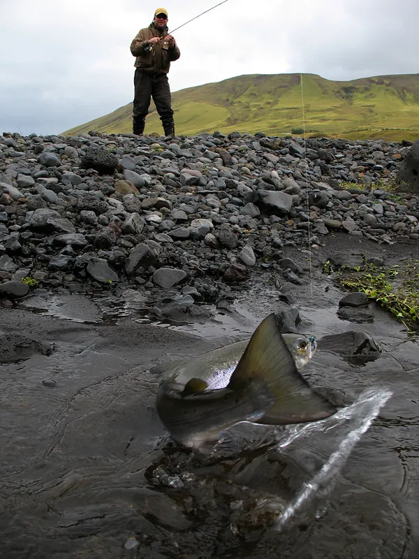 Nils is ready to run down and grab the stranded salmon - a common way of landing these fish.