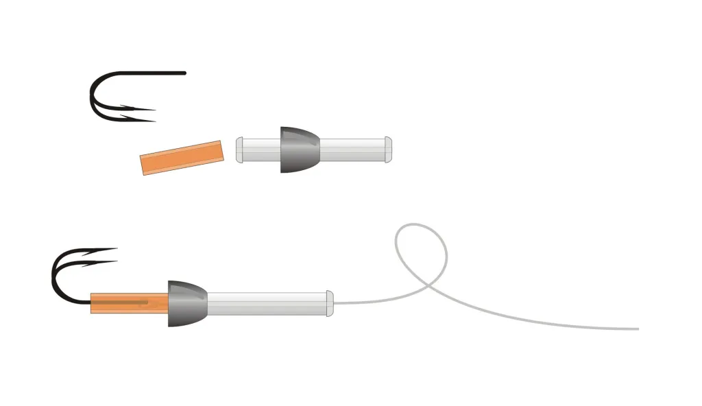 The bead or cone rests against the collar on the rear part of the tube. The front collar is made before spinning the deer hair. Mount the hook after passing the tippet through the tube and a piece of soft junction tube.