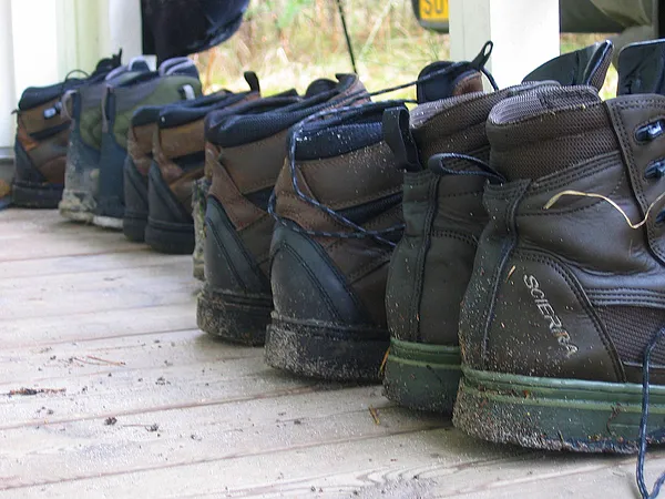 Seven anglers in a cabin means fourteen wading boots. This is just a small selection.