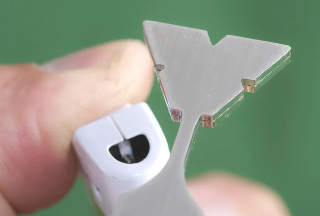 By placing the wing in the triangular tag burner, your can remove the tag and create a little notch making the wing very easy to tie in. This tool can take wings in different sizes
