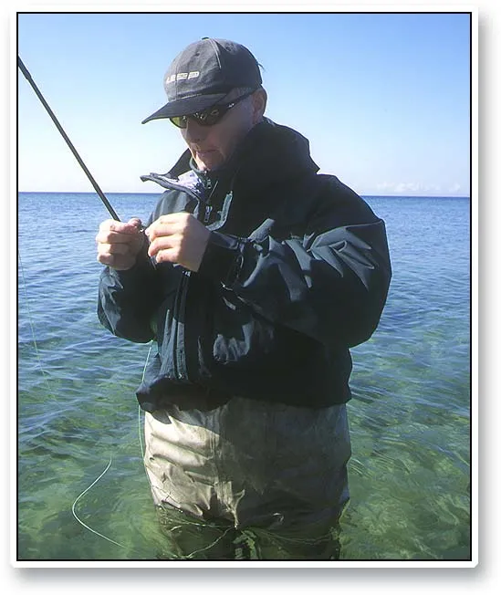 Tomaz Modic ties on a fly to tempt yet another sea trout. Tomaz did good with generic grey Woolly Bugger flies.