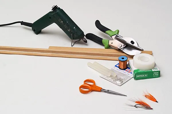 Hot-melt glue, a mitre cutter, adhesive tape, copper wire, pearls and scissors. Add a ruler and a pencil, and you have what it takes.