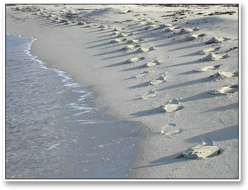 Our tracks in the sand cast long shadows in the late afternoon. A few waves and they are gone - as are we after a long, fruitless fishing day.