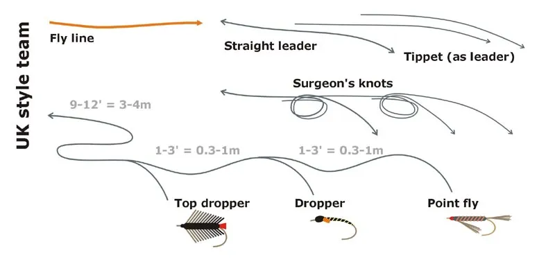 In the UK, Ireland and Scotland it's quite common to fish teams consisting of two or three flies. These are often fished og long, straight leaders extended with tippets of the same thickness.