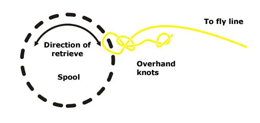 On ventilated spools with bars in stead of a solid axle you can just tie the backing onto one of the bars. Direction doesn't mean much in this case.