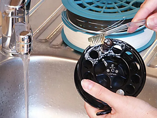 Plain tap water and dish washing soap are simple means to clean dirty reels. Use a toothbrush to get into corners and crevices.