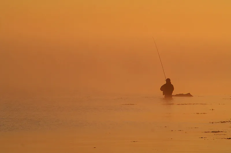 This is the result of zooming in on a distant angler during sunrise on a very misty morning. When the sun cleared the horizon is blazed this extremely orange light through the mist and created this fantastic scene where sky and ocean blends so smoothly.