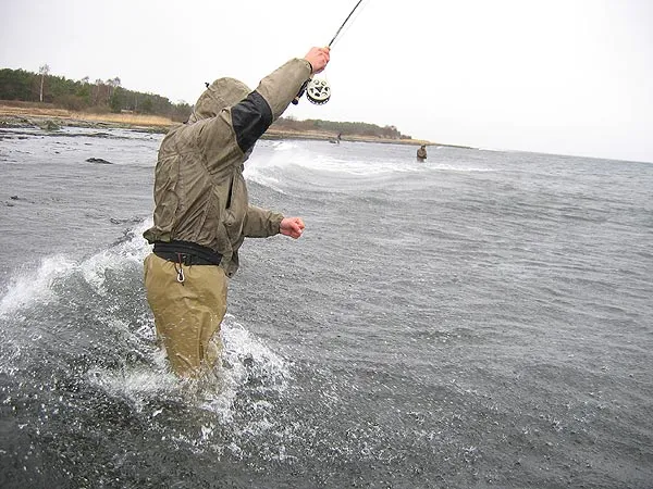 You cannot imagine how windy this was! 20 metres per second was enough to make us tumble and struggle for balance, but not enough to keep us from fishing. Kasper - in the picture - brought four sea trout to hand in these conditions.