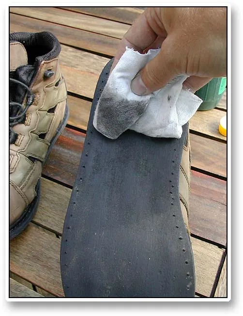 Thinner of acetone will remove the last bits of dirt and glue and clean the bottom of the boots before the glue is applied.