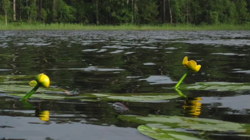 The bright yellow flowers reflect nicely in the surface of the lake in spite of it being slightly riffled