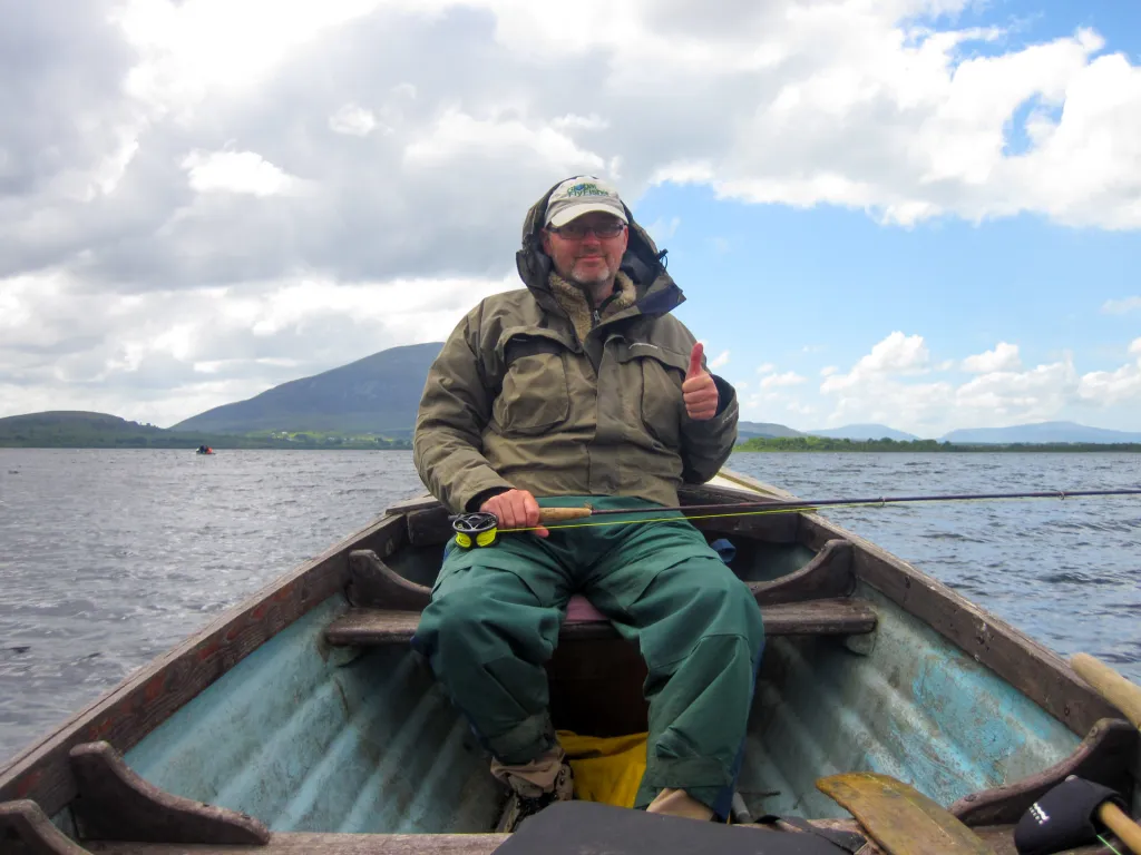 Well seated in the stern of the boat, ready for wind, rain and fish