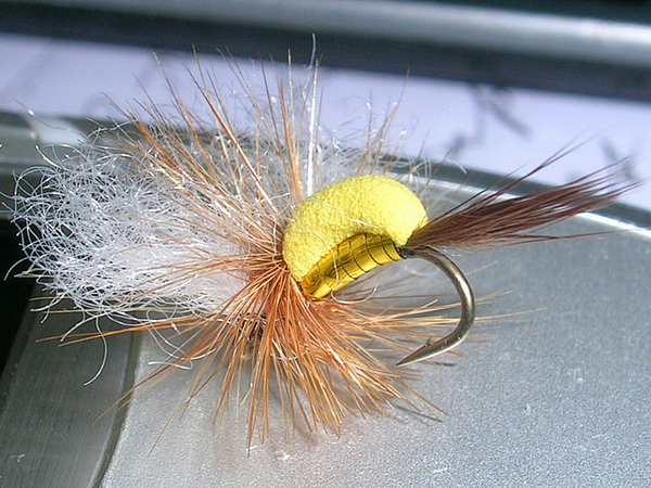 The "Dindi Gold". This little sized 14 & 16 Humpy style puffball with gold body, yellow foam back and pillow fill wing is very easy to follow for an ageing fly fisher. It refuses to sink and has worked brilliantly in bright sunlight.