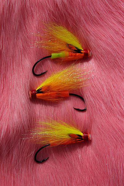 Very colourful tube flies on a hot coral pink dyed pelt!!