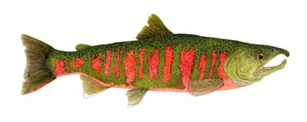 Watercolor study of a Male Masu (Cherry) Salmon in Spawning Colors. Found in the waters off Japan & Korea.