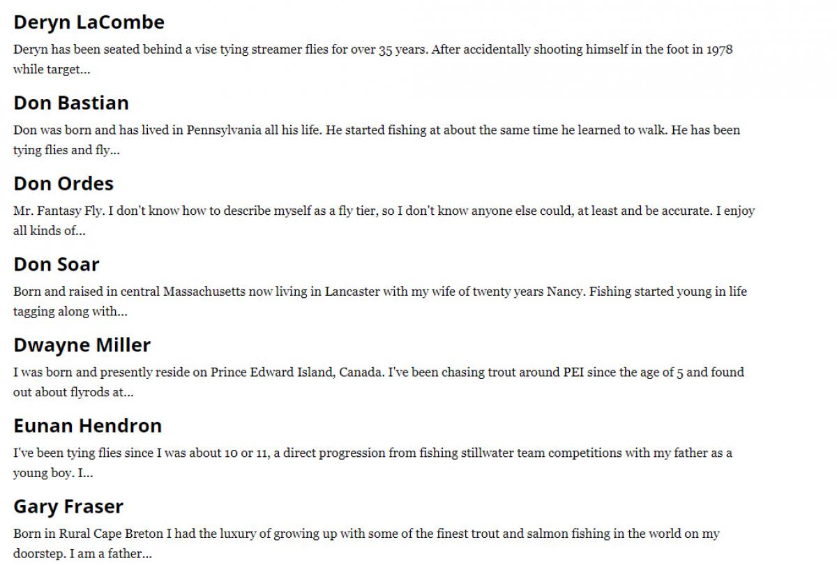 Here is a listing of the tyers who are taking part by tying streamers for the Streamers365 project. If you would like to join the ranks, please take a look at the about us page for information on how to submit. We will be cutting off the submissions shortly as we are getting very close to capacity.