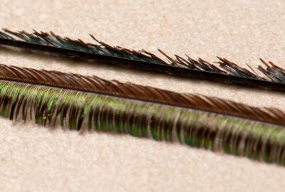 First you must steam the herl. Steaming is done by putting a kettle with a little water over the stove, and holding the herl a bunch at the time into the ray of steam. As you will notice they will straighten or bend lightly and the barbules (the small, shiny, green 'hairs') will rise and the herl will appear really nice looking afterwards.