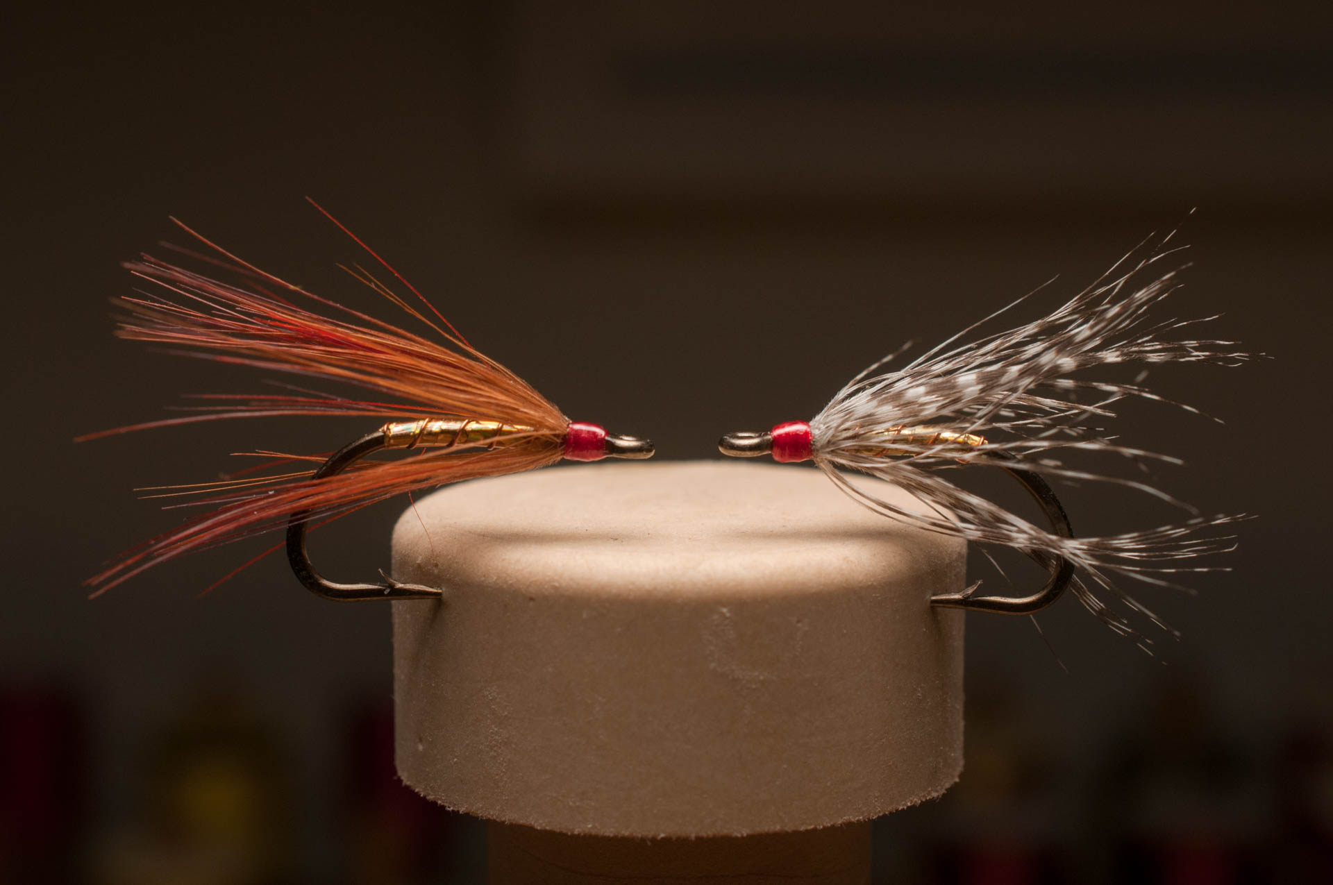 A couple of simple sea trout flies tied with a ribbed tinsel body and a golden pheasant hackle (left) and a mallard hackle (right)