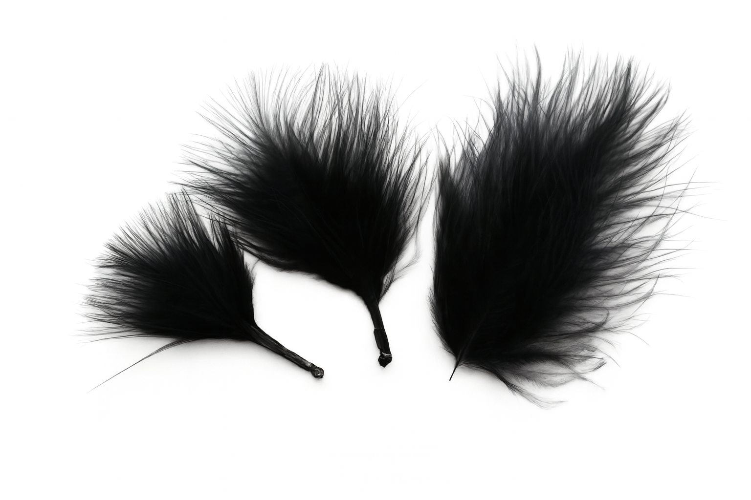 The main characteristic of the marabou feather is it's fluffiness. The feather is very soft and mobile and has no willingness to"marry" and form a uniform surface like it's known from many other feathers such as body feathers, coverts and wing feathers. It's not spiky or stiff either like hackle, but is a very fluffy, downy and soft feather.